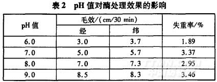 由表2可知,增大处理浴pH值,织物毛效提高。处理浴pH值为6.0和8.0时,精练汗布的失重较小,可能是由于酶活不足;pH值为7.0和9.0时,织物失重较大。为了减少实际生产中酸中和等工序,并考虑果胶酶活力等因素,保持处理浴的pH值为近中性,即无需调节pH值直接应用。