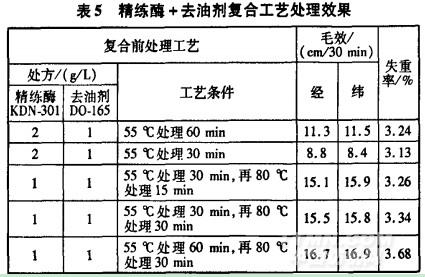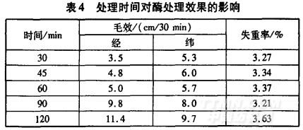采用精练酶KDN-301 2 g/L,在中性浴中于55℃处理不同时间,测定其失重率和毛效,见表4。
