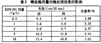 取不同用量精练酶KDN-301,在中性浴中于温度55℃处理汗布60 min,测定其失重率和毛效,见表3。