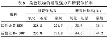 样品同2·2·1,测定染色羊毛织物的断裂强力及断裂伸长率,结果见8。