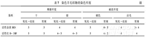 用活性金黄BES及活性红B-3BF对羊毛织物常规染色及过硫酸钾/硫脲氧化还原体系染色,染料用量2%(owf),然后测定摩擦牢度及耐洗牢度,结果见表7。