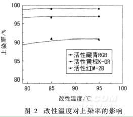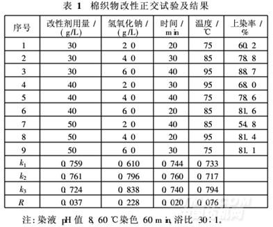 表1中,各因素对上染率影响按大小顺序排列为:氢氧化钠用量(改性温度(改性剂用量(改性时间。