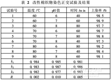 将优化改性工艺处理的棉织物采用L9(33)正交试验进行染色,测试改性棉织物的上染率,见表2。
