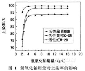 (1)氢氧化钠用量对上染率的影响在阳离子改性剂用量为40 g/L、氢氧化钠用量为2. 0~16 g/L的改性液中,于95℃对棉织物改性处理30 min,然后水洗至中性,烘干。用三种活性染料进行