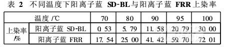 子性,与PARSTER纤维上的阴离子基团反应生成离子键,从而完成染色过程。下面以分散型阳离子蓝SD-BL与阳离子蓝FRR为例,比较它们在染色初期不同温度下的上染率。