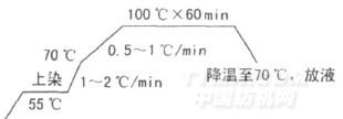 众所周知,当染色温度超过了纤维的玻璃化温度时,纤维的大分子链运动增加,纤维结构变得相对疏松,大量染料在较短的时间内迅速上染,从而造成染色不匀。因此,染色过程中必须严格控制升温速率。当温度在70℃以下时,升温速率为1. 5~2℃/min;当温度到达PARSTER纤维的玻璃化温度后,升温速率应控制在0. 5~1℃/min,具体升温曲线如下: