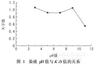 选用醋酸和碳酸钠为pH值调节剂,按1. 3. 2节工艺(下同)对珍珠纤维织物进行染色,织物K/S值随染液pH值的变化如图1所示。