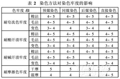 由表2可知, 4种染色方法的干湿摩擦牢度都可达到4级以上,耐皂洗色牢度和耐汗渍牢度除变色牢度外,都可达到4级以上。而同媒染色法较预媒染色法和后媒染色法工艺简单,可操作性强,节约用水和热能,更利于生产,节约成本。