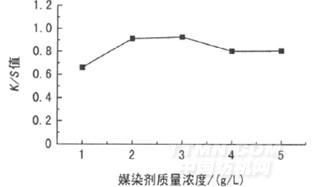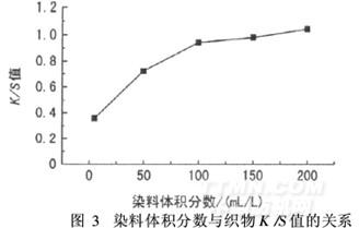 染料体积分数与珍珠纤维织物K/S值的关系见图3。