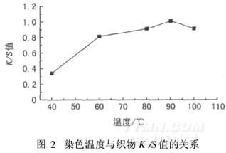 珍珠纤维织物的表观得色量随染色温度的变化如图2所示。