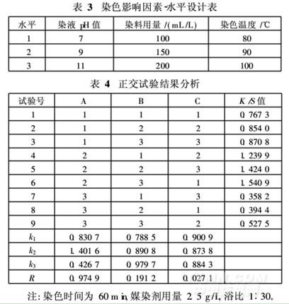 综合以上单因素试验,选取染液pH值、染料用量、染色温度3个因素进行正交试验。因素水平设计和染色试验结果见表3和表4。