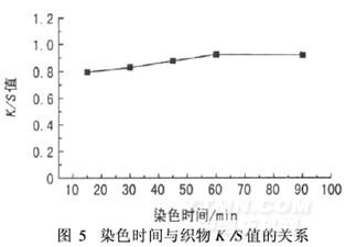 图5中,染色15 min,织物K/S值即达到0. 794 3。之后织物K/S值不断增加,染色时间达60 min时,染料的吸附和解吸达到平衡,织物K/S值达到最高。染色时间达90 min时,织物K/S值略微降低。这可能是由于染色时间过长,导致部分染料解吸。因此,染色时间初步定为60 min。