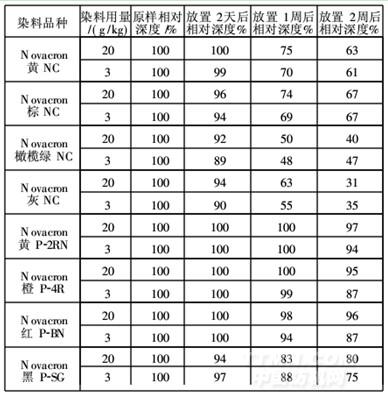 从表1可以看出,NovacronNC染料有很好的提升力,而且其最大得色量均在2.5个相对深度以上(除Novacron黄NC在2个相对深度以上外)。