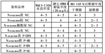 从表7可以看出,NovacronNC染料的M&SC10A水洗牢度都在4级以上,说明其耐过氧化物牢度很好;耐氯牢度也很好,除Novacron灰NC耐氯牢度为3~4级外,其余均在4级以上;干摩擦牢度均在4~5级,湿摩擦牢度均在2~3级以上。