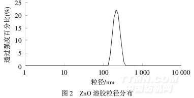 由图2可见,ZnO粒子平均粒径在0.25μm左右,粒径分布相对集中,大致分布在0.13~0.37μm,具有很好的置信度.