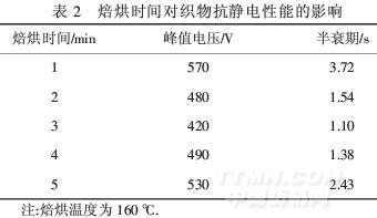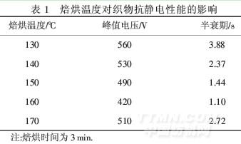 由表2可以看出,随着焙烘时间的延长,峰值电压和半衰期不断降低,抗静电性能不断增强;3 min时峰值电压和半衰期达到最小值;超过3 min后,随时间的延长,峰值电压和半衰期不断增大,抗静电性能减弱.原因是焙烘时间过短,整理剂在纤维表面未能形成连续导电膜;只有当时间合适,才能产生良好的抗静电效果;时间过长,导电膜分裂,抗静电性能下降.因此,较佳焙烘时间为3 min.