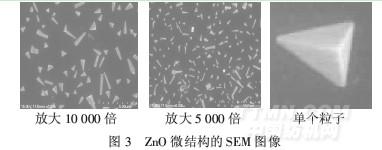 由图3可以看出,分布在基底上的大部分颗粒呈角锥状,角锥状结构的形貌比较光滑、均匀,少量的颗粒呈棒状.粒径/nm