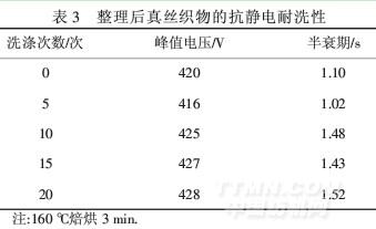 由表3可以看出,随着洗涤次数的增加,对真丝织物抗静电性能影响不大.说明整理剂与纤维间结合得很好,ZnO溶胶处理后织物的抗静电性能具有很好的耐洗性.洗5次时,抗静电性能变好.原因是整理剂与纤维之间形成了较好的结合,此时织物呈收缩状态,粒子间空隙较小,导电膜较致密.