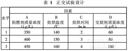 (1)取FPK8002阻燃剂质量浓度、交联剂质量浓度、焙烘温度和焙烘时间为四个因素,分别选取三水平,依据L9(34)表安排试验,因素水平见表1。