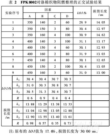 结合前期工作[3],在单因素试验基础上,采用正交试验方法,筛选棉用阻燃剂FPK8002对涤棉织物的优化工艺,并测试不同整理条件处理后织物燃烧性能的变化,结果见表2。