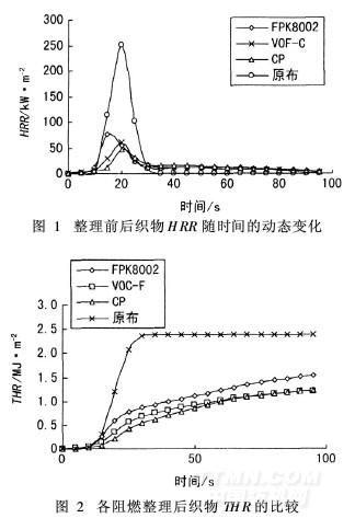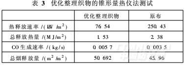 采用锥形量热仪法,对经优化整理工艺的织物进行测试,并与原布比较,结果见表3。