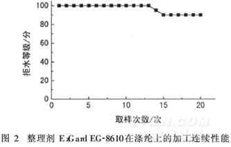 本试验以染色涤纶面料为例,连续浸轧整理液,过测定整理后织物的拒水性能,考察整理剂的加工续性能,结果如图2所示。由图2可以看出, EzGard EG-8610对涤纶进行理,拒水效果的加工连续性较好。