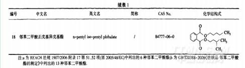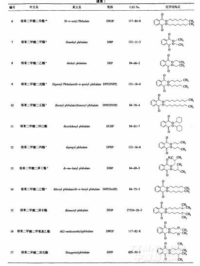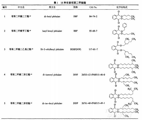 美国环境保护局在1997年提出了70种属于环境激素的化学物质,其中有8种是邻苯二甲酸酯,它们是DEHP、BBP、DBP、DCHP、DEP、DPP、DHP和DPRP.[5]表1列出目前各国法规中涉及的以及经研究表明对人体和环境存在危害风险的18种邻苯二甲酸酯.