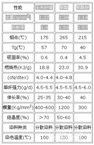 由表1可知,玉米纤维的熔点比聚酯和聚酰胺纤维低得多,故染整加工中温度控制要注意,且其产品不适用于耐热的用途。但其折射率较低,易染得表观颜色较深(这不是指染料的上染率),且聚乳酸纤维有优良的耐晒性、抑菌和防霉性,其服用性能与聚酯纤维比较如表二所示。