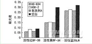 其用量的增加,水煮残液的吸光度减小。皂洗剂HS-634用量对活性黄BF-3R水煮残液吸光度的影响较大,对活性蓝GG和活性红BF-3B的影响较小。当皂洗剂HS-634用量达到1.2g/L时,活性黄BF-3R和活性红BF-3B染色纯棉针织物水煮残液的吸光度降低约50%,活性蓝GG染色纯棉针织物水煮残液的吸光度降低约30%。这是因为皂洗剂HS-634产品为高分子聚合物,具有良好的螯合力和分散力,可明显提高染色织物的皂洗效果。