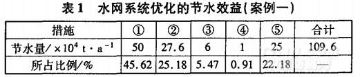 某公司年产3000万ITI各类织物的印花、染色产品。主要用水设备有皂洗机、氧漂机、丝光机、水洗机、定形机、印花机等。为了减少新鲜水的取水量,减少企业运行成本,从2000年开始,公司就开始对水网系统实行优化,并取得如表1所示节水效益。水网系统优化的总思路和具体措施如下: