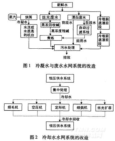 某公司[4]年产15000万m织物,经图1和图2所示水网系统改造后(图中虚线表示改造的工艺),取得节水效益见表2。