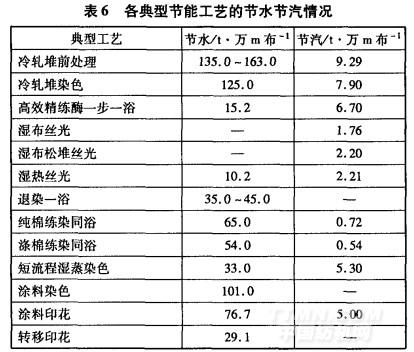 从上述案例分析可知,冷轧堆前处理工艺的节水效果最好,每万m布节水135~163t,节约蒸汽9.29t。而在染色和印花工序中,冷轧堆染色、涂料染色、涂料印花都具有很好的节水效果,分别为125t/万m布、101t/万m布和76.7t/,万m布,具体见表6。