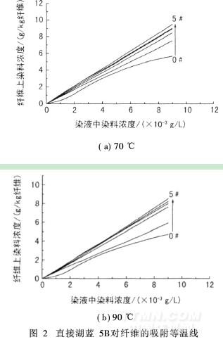 由图2可以看出,直接染料湖蓝5B对海藻酸钙纤维的吸附等温线属于弗莱因德利胥(Freundlich)类型,