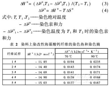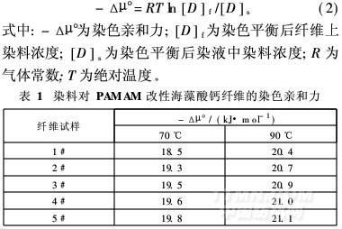 AM改性海藻酸钙纤维的染色熵为正值,说明直接染料湖蓝5B对PAMAM改性海藻酸钙纤维的亲和力很好,直接染料可以用于PAMAM改性海藻酸钙纤维的染色,实现海藻酸钙纤维的无盐染色。