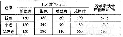 传统的浸染染色,从前处理到染色、皂洗等过程均在染缸内完成,耗时长,一般在8~12h。采用冷轧堆前处理后,将织物前处理在缸外进行,缩短了缸内加工时间。以染色耗时最长的翠蓝色为例,在不增加染色机台的情况下,产能可增加29.4%,而浅色甚至可以达到62.5%。参考染厂的订单结构,染色产能增加在40%一45%,效益十分明显。