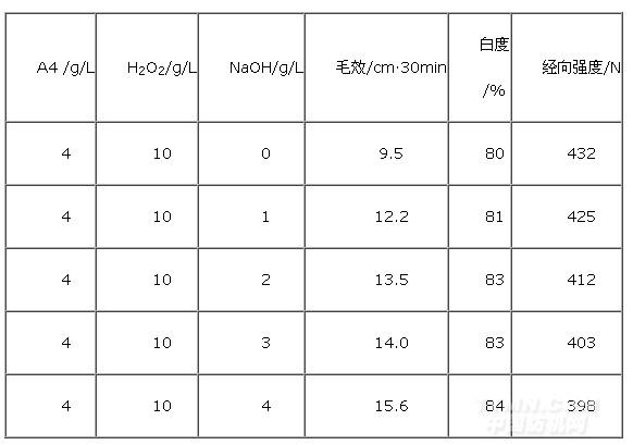 毛巾坯布上的蜡质、棉籽壳及各种浆料是影响毛效的主要因素,而烧碱的加入可以使织物上粘着的淀粉等浆料发生溶胀,便可容易洗去。下表是烧碱用量对毛效的影响。