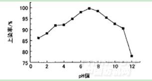 图4中,染浴pH值为7时,上染率最高。