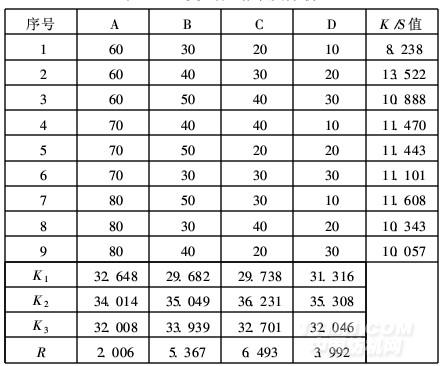 在单因素试验的基础上,选活性红M-3BE进行正交试验。以染色温度、食盐用量、纯碱用量和固色时间为四因素,以染色纱线K/S值为考察指标,采用四因素三水平进行L9(34)正交试验,进一步优化染色工艺。试验设计及结果见表2和表3。