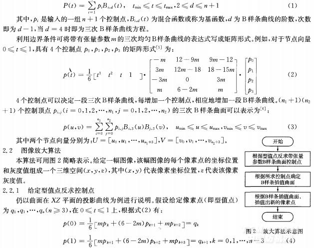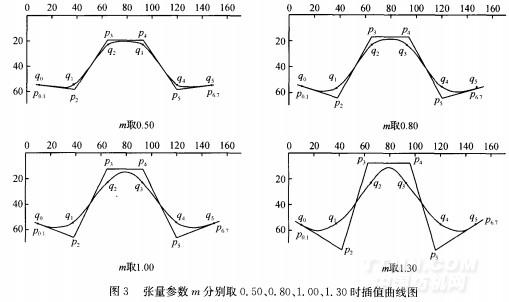 根据上节求出的控制顶点,以及式(3)可得出带张量参数的三次均匀B样条插值曲面。m越小,得到的曲面越靠近B样条曲面的控制网格(由各个控制顶点组成),也可以说样条越松;m越大,越偏离B样条曲面的控制网格,样条越紧;m<0时曲线已超出控制网格。利用VC++6.0,笔者编程实现了m可调整的B样条插值曲面,如图3示。图3中q(—o,1,…,5)为已知像素点,P(—o,1,…,7)是通过2.1节求出的各个张量参数下B样条曲面在XZ平面投影的控制多边形。从图3中可以看出:m分别为0.50、0.80时,随着参数的减少,曲线越来越陡峭;一1.O0时,即为普通三次均匀B样条曲线;为1.30时,曲线变的很紧,用于图像放大后,图像边缘将比较模糊,不符合要求。