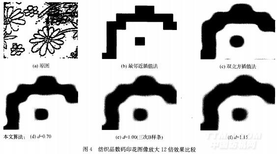 为了验证该方法的有效性,利用VC++6.0E7]对图4a中的图像进行了试验,选图中左下方的方框处进行高倍放大。很明显,最邻近插值法(图4b)处理后图像出现了马赛克现象;双立方插值方法(图4c)处理后图像边缘比较模糊。后三幅为本文图像放大方法,观察图像边缘处,张量参数为0.70(图4d)时的放大图像边缘最为锐利,但是,存在过冲,仍需要再处理,才能达到更好的放大效果。图4e为张量参数为1.00时放大图像,即为普通三次B样条插值放大方法,图像边缘比较模糊。图4f为张量参数为1.15时放大图像,边缘更加模糊。