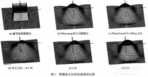 利用OPENGLE]编程实现了对图4的灰度曲面显示。为便于观察,截取该曲面图的一部分,如图5所示。从图5可以看出,张量参数一1.O0时的放大效果接近Photoshop双立方插值法的放大效果,本文方法中张量参数d=0.70时,放大效果接近理想的PhotoZoom(图像放大软件,已申请专利)中S-Spline方法的图像放大效果。