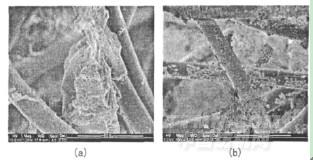 从图1(a)可以看出,发光材料在织物表面发生了团聚;图1(b)中,涂层浆经分散处理后,发光材料在织物上分布较均匀,较少发生团聚。