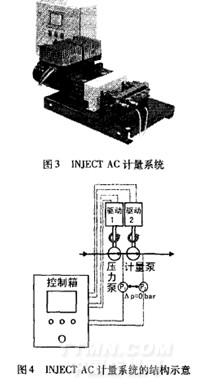染料或助剂在压力条件下(图2的进料点2或3)注入,需要使用高压型INJECTAC计量系统,其结构如图3、图4所示。这类系统甚至能够在高达300×10 Pa的压力下计量,计量精确率100%。为达到这个目标,INJECTAC计量系统需要配备两个串联泵。第一台泵提供所需要的压力,第二台泵进行无容积损失的计量。