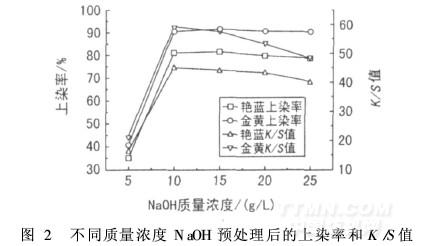 配制不同NaOH质量浓度预处理液(浴比30∶1,醚化剂30 g/L),其它条件同上,染色后测定上染率和K/S值,见图2。