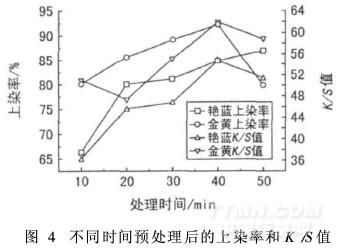从图4可以看出,随着预处理时间的延长,尤其在超过20 min后,上染率和K/S值上升幅度不大,预处理30 min可以满足后续的染色要求。