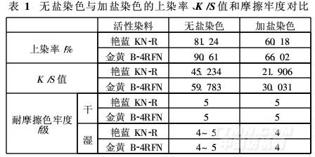从表1可以看出,棉织物预处理后再进行活性染料无盐染色,上染率和K/S值明显高于常规加盐染色,干湿摩擦牢度略高于或相当于加盐染色。