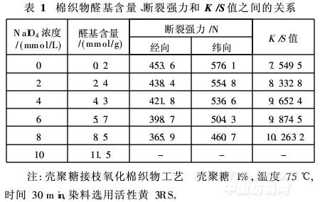 物后,纤维素大分子葡萄糖剩基中2, 3-键断裂,得到二醛基纤维素,经壳聚糖溶液处理后,在醛基与氨基之间形成席夫碱,从而在壳聚糖与棉织物之间产生牢固的化学键交联。理论上,氧化棉织物中醛基含量越高,与棉织物发生共价结合的壳聚糖量越多,增深效果越好但要提高氧化棉织物中的醛基含量,必须提高棉织物的氧化程度,这样容易造成棉织物强力损伤。表1为高碘酸钠浓度与氧化棉织物中醛基含量、断裂强力、染色K/S值之间的关系。