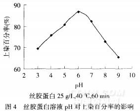 从图4可知,pH<6时,pH越小,丝胶蛋白分子问的静电斥力增大,不利于竹原织物对丝胶蛋自的吸附所以上染百分率下降.pH=6时上染百分率最大,原因是竹原纤维是纤维素纤维,具有耐碱不耐酸特征,但竹原纤维经高碘酸钠氧化生成的二醛基纤维素具有耐酸不耐碱的特性,丝胶蛋白表面部分氨基可以H+结合,削弱纤维表面负电性,有利于染料靠近纤维表面,