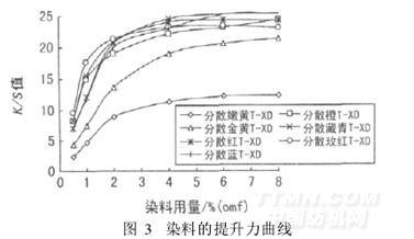 从图3可以看出,在染料质量分数从0. 5% (omf)增加到4% (omf)时,几乎所有染料染色织物的K/S值都迅速提高,说明在这一染料质量分数范围内,这些染料的提升性能都很好。染料质量分数超过4%以后,随着染料质量分数的提高,提升力曲线的斜率变小,说明染色织物的K/S值增加速度变慢,染料的提升性下降。染料质量分数达6% (omf)以后,大部分染料的提升力曲线趋于平缓,说明染料的提升力不再增加,但少数几只染料在染料质量分数超过6%以后,K/S值仍有缓慢增加,如分散金黄T-XD、分散藏青T-XD、分散橙T-XD等。分散嫩黄T-XD的提升力曲线最为平缓,这是由黄色染料的颜色特性所决定的,并非染料本身的提升力就低。