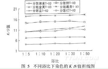 从图5可以看出,大部分染料的浴比依存性很低,在不同浴比下染色后测得的K/S值都是在一个很小的范围内波动,考虑到试验误差的影响,可以认为染色浴比的变化对染料的上染性能影响不大。少部分染料,如分散红T-XD的K/S值则随浴比的加大而增加,在浴比1∶30下K/S值达到最大值,但上升的幅度很小,可以认为不影响应用性能。实际应用中,可以根据需要尽量选择小浴比进行染色,以满足当前染整工业对节能降耗和环保的要求。